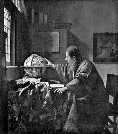 彼時(shí)的藝術(shù)家們對天體包括對地球本身都充滿了極大的研究興趣。以“荷蘭小畫派”的代表畫家維米爾為例,他在光學(xué)、制圖學(xué)、音樂、地理學(xué)和天文學(xué)等領(lǐng)域都有淵博的知識積累。繪制于1668年的油畫作品《天文學(xué)家》,從命名上就體現(xiàn)了他對當(dāng)時(shí)先進(jìn)科學(xué)技術(shù)的關(guān)注。也是在啟蒙運(yùn)動時(shí)期,繪畫作品中出現(xiàn)彗星的場景不再伴隨著人類的驚懼、疾病與死亡。相較于托勒密時(shí)代所認(rèn)為的不詳預(yù)兆,彗星在1705年得到了天文學(xué)上的正名,哈雷發(fā)表《天文學(xué)對彗星的簡介》,將其解釋為一顆具有周期回歸特性的天體。所以在另一位荷蘭畫家利弗·弗斯舒爾繪制的油畫《鹿特丹上空的1680大彗星》中,一顆從天而降的彗星出現(xiàn)于鹿特丹上空,城市中的人們并未驚慌失措,而是井然有序地駐足觀望,甚至拿起了手中的望遠(yuǎn)鏡觀察。