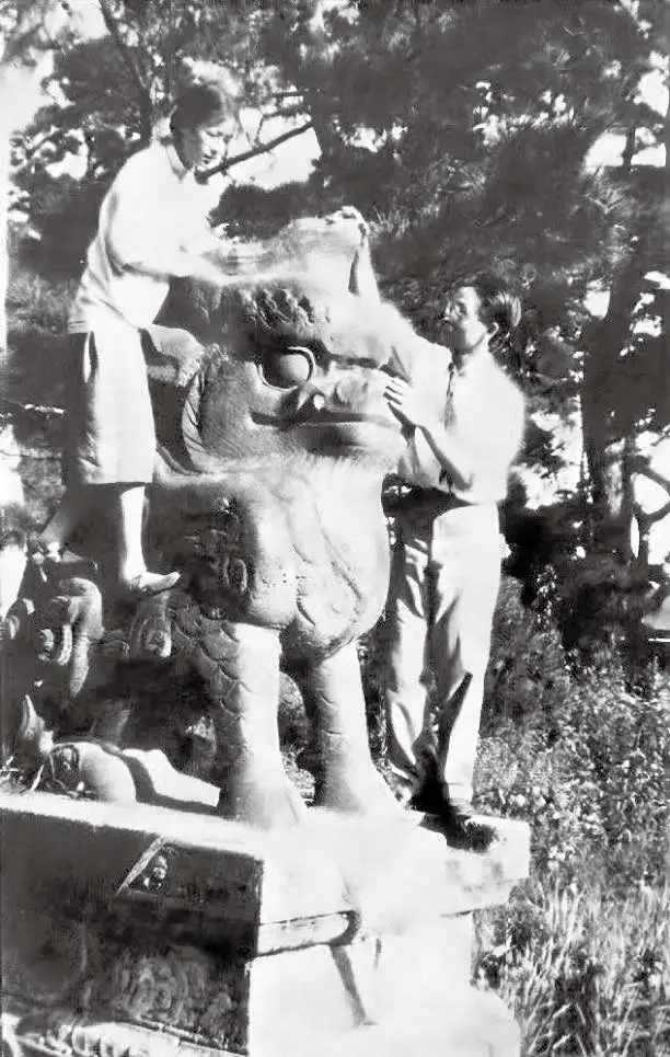 林徽因(左)與梁思城測(cè)繪北陵麒麟
