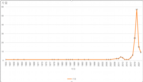 2021年底,我確定以涼山本土的影像創(chuàng)作為自己的研究方向,觀察有關(guān)彝族的影像創(chuàng)作。截止到2022年筆者進(jìn)入田野并進(jìn)行資料整理時(shí),發(fā)現(xiàn)當(dāng)時(shí)涼山已經(jīng)產(chǎn)生了大量彝族自我生產(chǎn)的、以母語電影為外殼、展現(xiàn)彝族人生活、傳遞自身價(jià)值觀的影片,累計(jì)至少有149部,并且曾經(jīng)呈現(xiàn)出增長的趨勢(如下圖),而為何會(huì)出現(xiàn)2021年這種暴增現(xiàn)象?這是當(dāng)時(shí)的疑問。