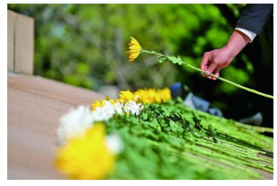 4月3日,人們?cè)谖挥诮K省句容市茅山風(fēng)景區(qū)的蘇南抗戰(zhàn)勝利紀(jì)念碑前敬獻(xiàn)鮮花。新華社發(fā)
