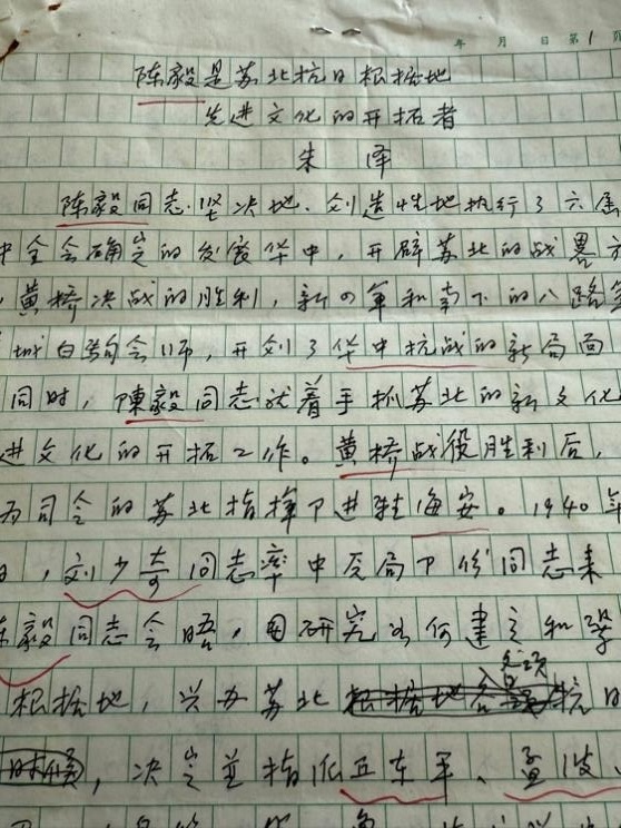 《陳毅是蘇北抗日根據(jù)地先進(jìn)文化的開拓者》手稿,筆者收藏