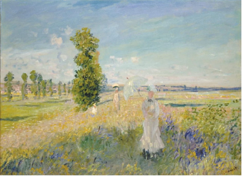 《散步》創(chuàng)作于莫奈創(chuàng)作風(fēng)格成熟期,描繪了卡米爾手持陽(yáng)傘,裙擺隨風(fēng)飄揚(yáng),與兒子、乳母在夏日田野中散步的溫馨場(chǎng)景