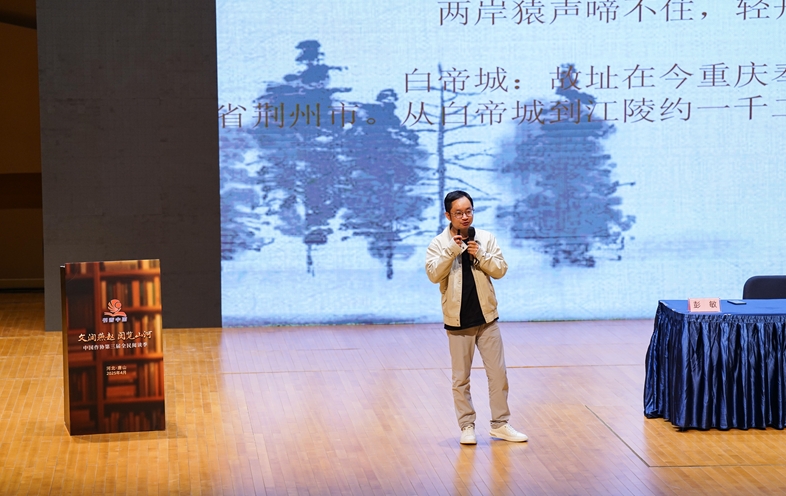 彭敏面向初中生主講《詩詞背后有乾坤》,聚焦古詩詞背后的歷史故事與文化內(nèi)涵。他打破“標(biāo)簽化”的詩人形象,通過解析李白、杜甫等詩人的人生軌跡與創(chuàng)作背景,帶領(lǐng)學(xué)生理解詩詞中的情感邏輯與人文精神,感受古典文學(xué)跨越千年的生命力,引導(dǎo)青少年從詩詞中汲取文化養(yǎng)分。在問答互動(dòng)環(huán)節(jié),彭敏帶來了歷史背后的有趣知識(shí)——端午節(jié)最初究竟是紀(jì)念誰的?屈原吃過粽子嗎?由此鼓勵(lì)學(xué)生們?cè)陂喿x中積極探索,主動(dòng)追問,培養(yǎng)勤于思考拓展知識(shí)的良好習(xí)慣。
