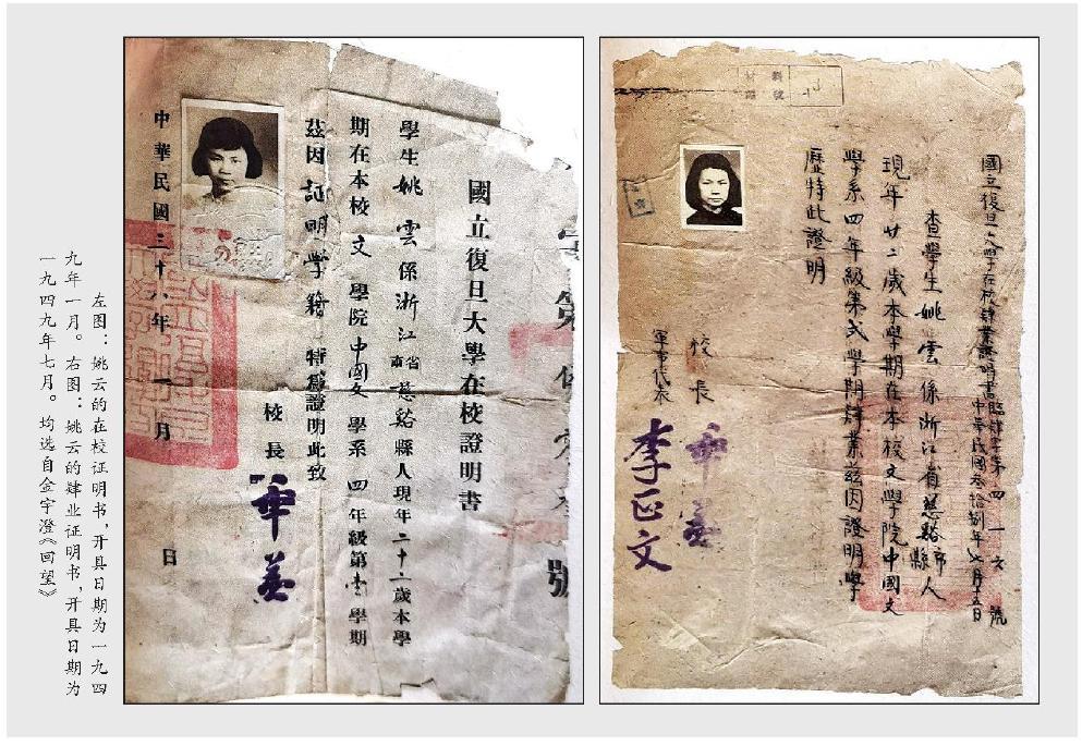 左圖:姚云的在校證明書,開具日期為一九四九年一月。右圖:姚云的肄業(yè)證明書,開具日期為一九四九年七月。均選自金宇澄《回望》