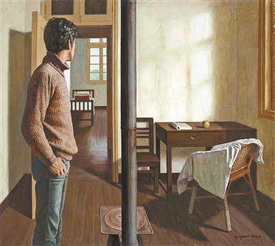 《思想者》左手側(cè)的墻面上,懸掛著袁慶一于1984年創(chuàng)作的布面油畫《春天來了》。畫面中一位穿著高領(lǐng)毛衣的男青年側(cè)身轉(zhuǎn)頭望向窗外,窗外隱約露出春天的嫩綠,寫字臺上翻開的書本和青蘋果,是上世紀70年代末80年代初恢復高考后一代青年奮斗和期待的映射。
