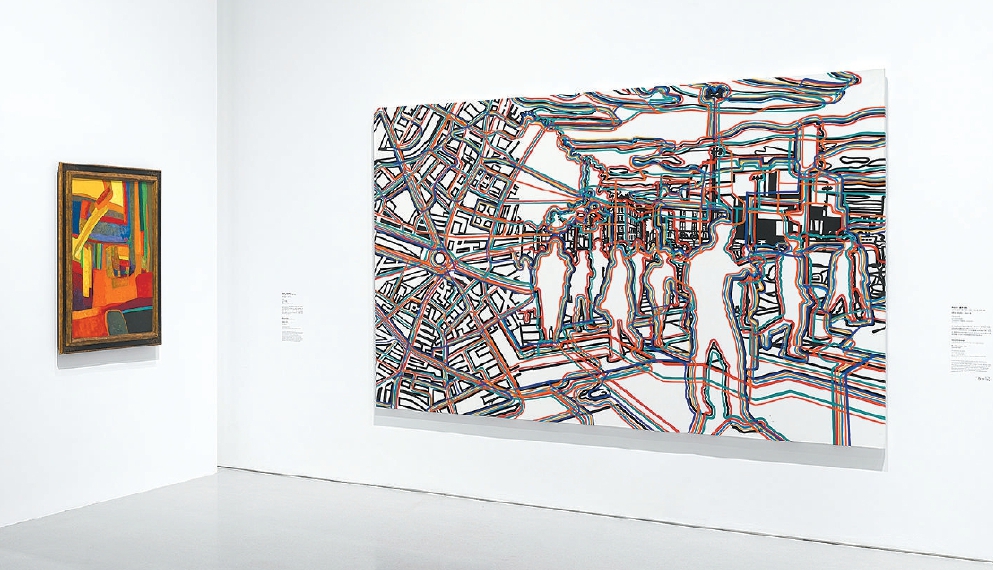 呈現(xiàn)鳥瞰多維視角的“俯瞰之景”板塊,顯得頗為典型??死锼沟侔哺嬖V記者,這些創(chuàng)作對應(yīng)著飛機(jī)發(fā)明及普及后給人們視角帶來的顯著變化。例如,讓·杜布菲創(chuàng)作于1944年的《幸福的鄉(xiāng)間》,盡管畫面的彩色方格色塊帶些抽象色彩,但讓人能感覺到田野的邊界,就像在飛機(jī)上眺望大地。熱拉爾·弗羅芒熱描繪自己巴黎工作室附近景觀的《巴士底網(wǎng)絡(luò)》,創(chuàng)作于2007年,畫面以縱橫交錯(cuò)的彩色線條勾勒的城市布局,乍一看有些像衛(wèi)星圖?!扒ъ曛?,智能手機(jī)、全球定位系統(tǒng)等新事物都出現(xiàn)了,這幅畫與街區(qū)衛(wèi)星地圖做了一個(gè)結(jié)合,說明藝術(shù)家緊跟時(shí)代變化?!?/p>