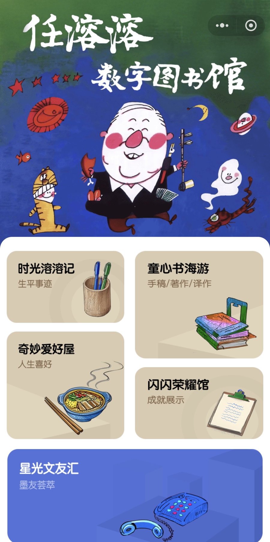 這一點,在先期上線的“任溶溶數(shù)字圖書館”的設(shè)計構(gòu)架上可見一斑。搜索“遇見任溶溶”小程序,首先映入眼簾的是漫畫家、被稱為上海美影廠“三劍客”之一的詹同為任溶溶繪制的人物形象,生動活潑。首頁小圖標(biāo)及小程序各板塊中的插畫均出自任溶溶之子任榮煉之手。這些飽含深情的創(chuàng)作讓這個“數(shù)字圖書館”既溫馨又獨具特色,五個特色板塊共同展現(xiàn)了任溶溶豐富多彩的文學(xué)人生。