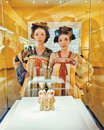 “我倆從陜西西安過來,特地穿了漢服,就是為了和‘姐妹花’合影!”展柜前,游客孫雅身著襦裙,和好友模仿女俑牽手叉腰、顧盼神飛的姿態(tài)。