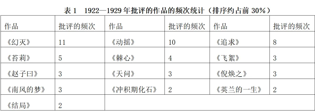 表1 1922—1929年批評(píng)的作品的頻次統(tǒng)計(jì)(排序約占前30%)