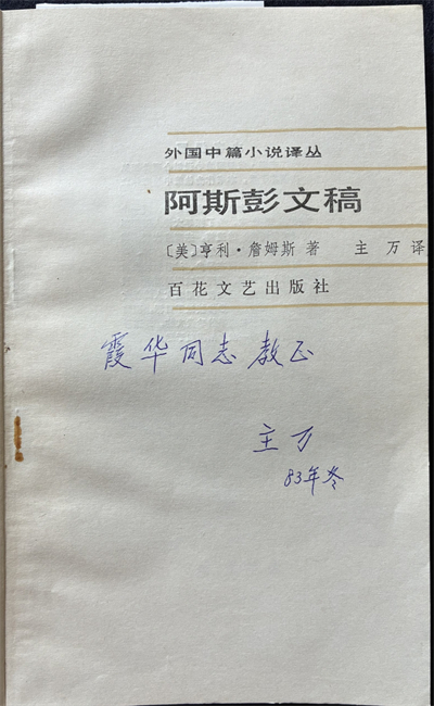 我買(mǎi)到的這本《阿斯彭文稿》,書(shū)名頁(yè)有譯者主萬(wàn)的題詞:“霞華同志教正。主萬(wàn),83年冬”。霞華應(yīng)該就是譯者曾經(jīng)的同事、華東師范大學(xué)外文系教授楊霞華,錢(qián)谷融的太太。錢(qián)谷融先生是很熟悉的,以前好多文學(xué)活動(dòng)都能見(jiàn)到他,慈眉善目、笑容可掬。而這位楊教授我無(wú)緣識(shí)荊。曾在吳俊的《追思我的導(dǎo)師錢(qián)谷融先生》一文中讀到,他們師生倆有次談到戀愛(ài)問(wèn)題,錢(qián)先生對(duì)吳俊說(shuō):“我也有苦惱啊,楊先生有時(shí)發(fā)起脾氣來(lái),會(huì)過(guò)來(lái)揪著我的耳朵從這個(gè)房間拉到那個(gè)房間?!眳强?xiě)道:“楊先生是我的師母,華東師大外語(yǔ)系的資深教授,年長(zhǎng)先生四歲,師母任副教授時(shí),先生還是小講師。……我在先生家里,多次聽(tīng)到隔壁楊先生直呼先生的名字,而先生說(shuō)起師母則總是楊先生三字?!保S平主編《師大憶舊(華東師大卷)》,江蘇鳳凰文藝出版社,2022年1月版,73頁(yè))