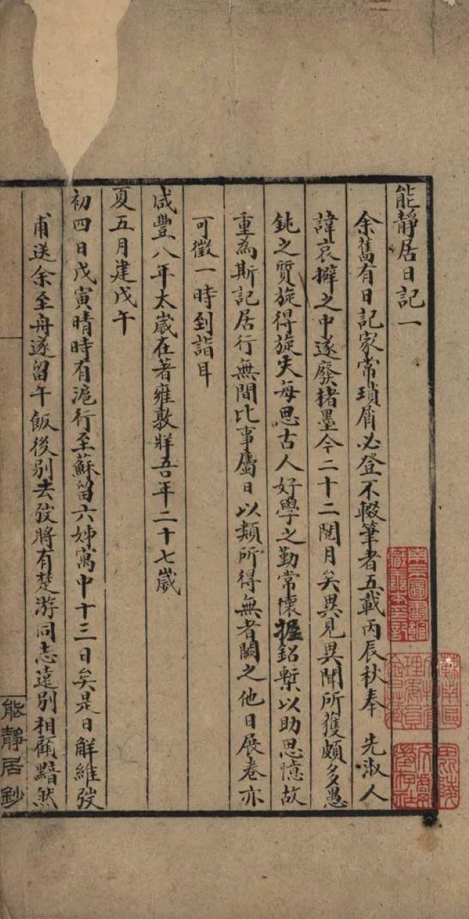能靜居士日記五十四冊(cè) 清武進(jìn)趙烈文(惠甫)撰 稿本 自咸豐八年五月初四日至光緒十五年六月二十止?;莞Χ邭q至五十八歲間日記。自咸豐八年至同治五年間書(shū)稿名“能靜居鈔”,每半頁(yè)十行,直行格本。自同治五年十二月至光緒十五年六月,書(shū)稿名“亦龍亦蠖之居”,每半頁(yè)十三行,方格本。兩種皆毛邊紙,未裝釘。