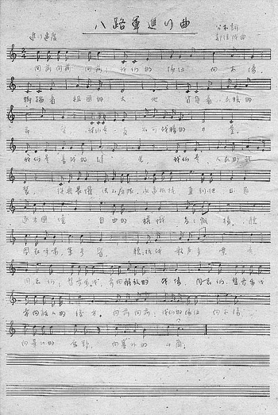 7月中旬,兩人抓住工作間隙,開始了這一宏偉的創(chuàng)作。公木首先完成《八路軍軍歌》歌詞,接著創(chuàng)作《八路軍進(jìn)行曲》歌詞。每寫完一篇,就交給鄭律成譜曲,只要鄭律成滿意便定稿。鄭律成則對每首歌曲提出獨(dú)特要求:《騎兵歌》要有馬蹄前進(jìn)的嘚嘚聲,《炮兵歌》要有震天響的氣勢,《八路軍進(jìn)行曲》要長短相間、寓整于散、韻律和諧、節(jié)奏響亮,中間還要插入三個四字短句,公木都一一照做?!栋寺奋娺M(jìn)行曲》原詞開頭就是“我們的隊伍向太陽”,鄭律成作曲時加了“向前!向前!向前!”3個短句,極富號召力量。