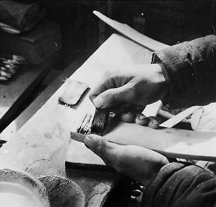 除了琉璃廠的高貨,普通制筆作坊主要分布在前門外打磨廠胡同,分東西兩部分,東面是一家一戶或個(gè)人單干的,西面多是有門面字號(hào)的店鋪。這些手藝人從各地到北平,組成過行會(huì)。1949年后,又組織到了一起,成立了毛筆社,也就是后來(lái)的北京制筆廠。