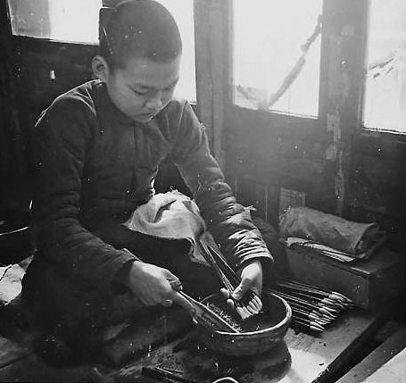 賈春發(fā)是傳統(tǒng)制筆業(yè)的后人,毛筆技師。他聽父親和師傅們講,民國(guó)年間,兩間房就能開作坊,居住與生產(chǎn)是混在一起的。比如,晚上睡覺的鋪板,白天支上就可以當(dāng)干活用的水板,干活的時(shí)候沒有凳子桌子,都是盤腿坐在炕上,把水板放到盤起的腿上,在水板上做活。