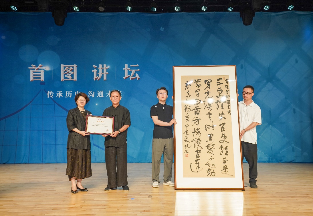 分享會(huì)后,吳悅石對(duì)出席發(fā)布會(huì)的社會(huì)各界嘉賓表示感謝,他強(qiáng)調(diào)石鼓文乃中華文明經(jīng)典瑰寶,素有“籀篆之祖”之譽(yù),批注石鼓文實(shí)因書畫研習(xí)所需——學(xué)書習(xí)畫必溯石鼓。然初學(xué)時(shí)苦于字形難辨、文意難解,遂決意逐字考釋。幸遇文字學(xué)、考古學(xué)新成果涌現(xiàn),終能以今人可解之語(yǔ)完成批注。惟愿后學(xué)能看懂、學(xué)通石鼓文。今歷經(jīng)十年書稿問(wèn)世,絕非個(gè)人之功,實(shí)乃古文字學(xué)界滋養(yǎng)使然。愿此書能引諸君沉潛經(jīng)典:于坐臥行止間認(rèn)真體悟,以身心相印的功夫深研傳統(tǒng)?;顒?dòng)的最后,吳悅石先生將書法作品《勸學(xué)·顏真卿》捐贈(zèng)給首都圖書館,為這場(chǎng)兼具深度與溫度的文化盛宴畫上圓滿句號(hào)。