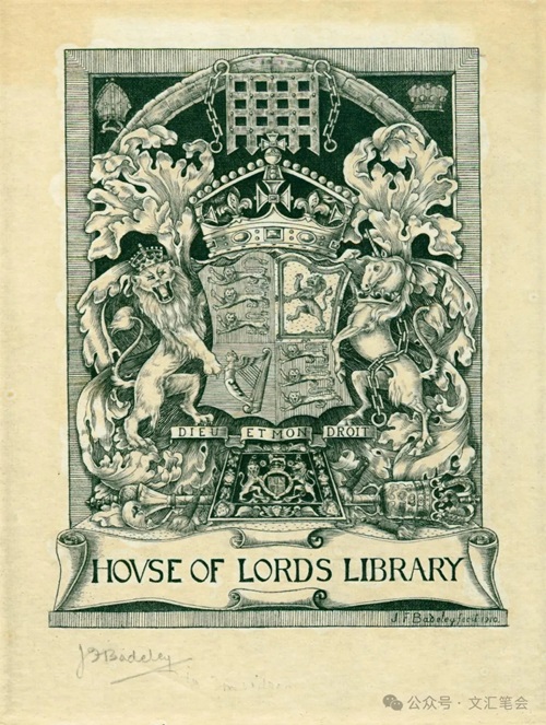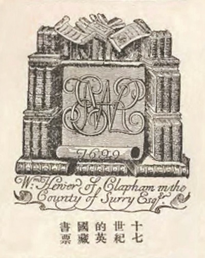我對英國藏書票的直觀認識始于上海圖書館徐家匯藏書樓收藏的英國作家狄更斯的藏書票。1989年在上海圖書館舉辦的“89上海國際藏書票邀請展”上,圖書館提供了一批貼有藏書票實物的西文藏書,其中有一冊英文版《中國第二次戰(zhàn)役紀事》,此書是狄更斯的個人藏書。1870年狄更斯逝世后,其藏書被送去拍賣。這本書被不知名的競拍人買下,輾轉帶到了上海,此人是誰?此書經(jīng)手了幾個人?不論有多少令我們想象的情節(jié),此書“可說是難得的中西文化交流的實物資料”(吳興文《我的藏書票之旅》,第131頁)。這張銅版雕刻的雄獅形象作品在1840年由一位愛好文學的木匠設計,畫面采用狄更斯五世祖所獲紋章的羽飾,即獅前足所持的馬耳他十字架,抬頭蹲伏于雙色絞絲花環(huán)上,構圖十分簡潔。