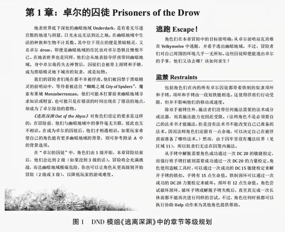 我們對比初版(OD&D)規(guī)則和后續(xù)規(guī)則會發(fā)現(xiàn),初版規(guī)則中并沒有怪物的等級,只有角色的等級,主持人只能通過怪物的數(shù)值來估算挑戰(zhàn)難度。而后續(xù)我們熟知的“怪物挑戰(zhàn)等級”(Challenge Rating.CR)則在2000年的第三版規(guī)則中才首次被引入。我們可以由此推出,作為優(yōu)化補充內(nèi)容而出現(xiàn)的CR系統(tǒng),是玩家與DM在游玩中實際需求的回應(yīng):CR系統(tǒng)幫助DM平衡遭遇戰(zhàn)難度,方便DM規(guī)劃出適合不同等級的玩家的冒險內(nèi)容。在這個“規(guī)劃”中,根據(jù)怪物等級、出現(xiàn)地圖與相關(guān)聯(lián)情節(jié)的“內(nèi)容模塊”已經(jīng)漸漸出現(xiàn)。名為“挑戰(zhàn)等級”而非“怪物等級”,其實在背后反映著游戲?qū)ν婕医巧壍囊龑?dǎo)。升級和新內(nèi)容模塊之間的對應(yīng)關(guān)系已經(jīng)開始出現(xiàn),開放之下的“線性”已初露端倪。