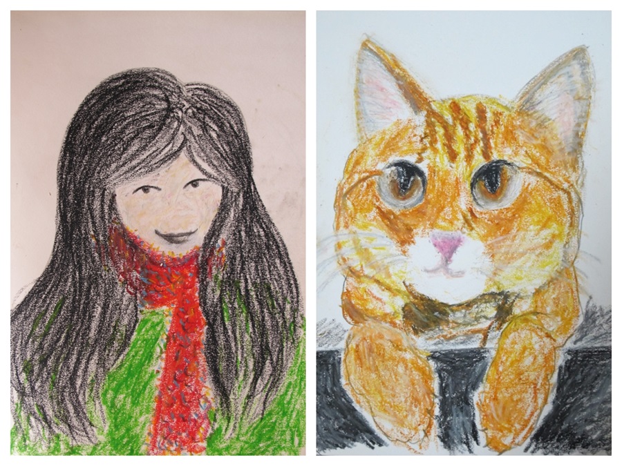 污士奇給仙人球愛(ài)水(左)和自己畫(huà)的頭像