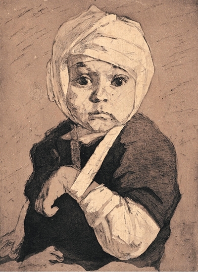 蘇聯(lián)版畫家在艱苦的衛(wèi)國戰(zhàn)爭中,同樣延續(xù)著這種不屈的精神接力。在這片國土上出現(xiàn)了一大批號(hào)召人民奮勇抗戰(zhàn)、揭露法西斯罪行的作品。托伊澤創(chuàng)作于1941年的石版畫《祖國母親在召喚!》中,身披紅袍的母親振臂高呼,召喚萬千兒女共赴疆場,她手中的宣言書如戰(zhàn)旗飛揚(yáng),身后刺刀林立直指蒼穹。哈爾夏克的銅版畫《被法西斯炸傷的孩子》則以紀(jì)實(shí)的線條刻畫戰(zhàn)爭中的孩童——粗糙的繃帶與清澈的雙眸對(duì)比鮮明,無聲控訴著戰(zhàn)爭的暴虐,為歷史留下不容磨滅的證言。
