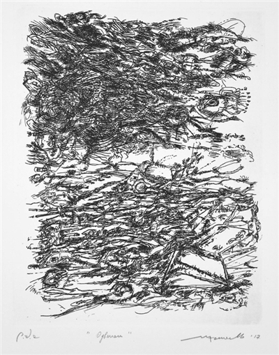 今年4月,上海多倫現(xiàn)代美術(shù)館舉辦“東西匯夢(mèng)——中意當(dāng)代版畫交流展”,將這一藝術(shù)形式帶回中國新興木刻運(yùn)動(dòng)的發(fā)源地。展覽不僅呈現(xiàn)藝術(shù)風(fēng)格的碰撞,更著重展現(xiàn)藝術(shù)家對(duì)傳統(tǒng)版畫技術(shù)的創(chuàng)造性轉(zhuǎn)化。例如,意大利藝術(shù)家馬里奧·托馬塞洛的抽象銅版蝕刻《奧吉納姆》與中國藝術(shù)家譚平的套色木刻《無題1》,將傳統(tǒng)版畫技藝轉(zhuǎn)向純粹抽象表達(dá)。前者通過凹版腐蝕線條構(gòu)建繁雜的無意象畫面,后者則通過富有張力的直線將畫面切割成極簡的幾何形態(tài)。兩位藝術(shù)家在深入掌握傳統(tǒng)技藝的基礎(chǔ)上,突破版畫原有的敘事功能,轉(zhuǎn)向?qū)π问?、材質(zhì)和印痕美感的探索,使古老技法煥發(fā)出新的生命力。