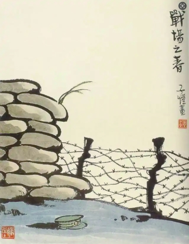豐子愷堅(jiān)信抗戰(zhàn)必勝,其漫畫作品灌注必勝的信念,充滿鼓舞人心的力量。他曾說:“古語云:‘眾志成城’,我們四百兆人團(tuán)結(jié)所成的城,是任何種炮火所不得攻破的!”他的漫畫作品尺幅小,題材微,卻具有強(qiáng)烈的藝術(shù)感染力。比如《生機(jī)》和《戰(zhàn)場(chǎng)之春》,主角均為一株小草,纖細(xì)柔弱,一棵從灰暗的斷壁中探出頭來,一棵在冰冷的鐵絲網(wǎng)邊昂首向天,寥寥數(shù)筆,生機(jī)立現(xiàn)。《戰(zhàn)場(chǎng)之春》中題詩曰:“誰言爭(zhēng)戰(zhàn)地,春色渺難尋。小草生沙袋,慈祥天地心。”殘酷的戰(zhàn)場(chǎng)上,小草頑強(qiáng)生長(zhǎng),印證著天地的慈祥之心,好生之德。