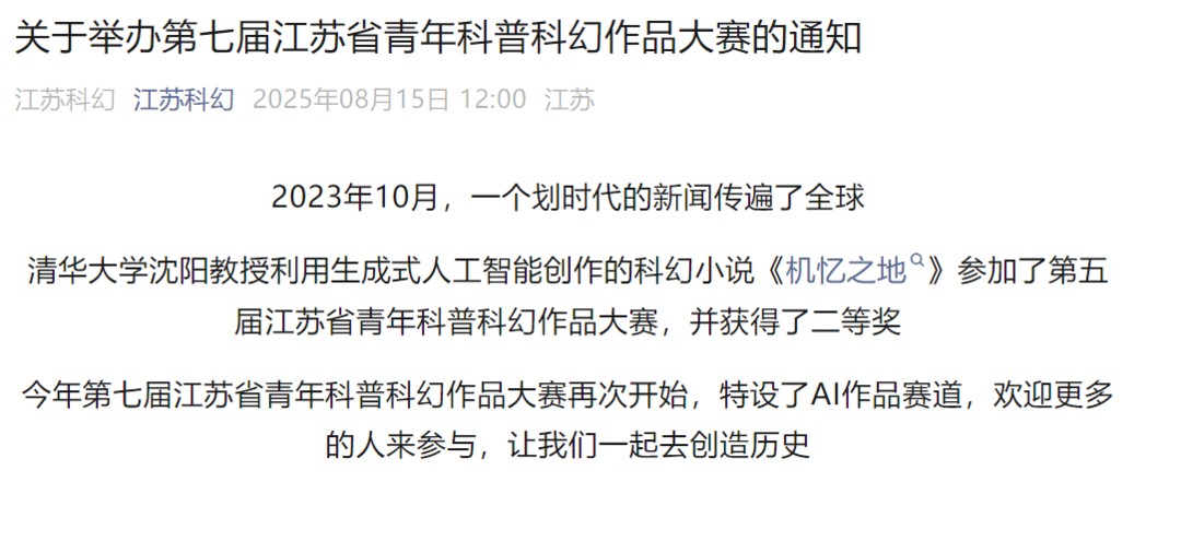AI科幻作品賽道的出現(xiàn)源于2023年清華大學(xué)沈陽教授在參加第五屆江蘇省青年科普科幻作品大賽時(shí)的獲獎作品《機(jī)憶之地》,該作品是利用生成式人工智能進(jìn)行的創(chuàng)作,付昌義表示,設(shè)置這一賽道主要是出于三方面考慮:“一是科幻的核心是探討科技與人類未來的關(guān)系。AI 賽道直接呼應(yīng)了當(dāng)下人工智能倫理、人機(jī)關(guān)系、后人類主義等熱門議題,讓作品更具現(xiàn)實(shí)關(guān)聯(lián)性。二是 AI 技術(shù)正在改變我們的創(chuàng)作方式。比賽通過增設(shè)賽道,推動創(chuàng)作者探索人機(jī)協(xié)作的新模式,拓展科幻表達(dá)的邊界。比如AI可能提供人類難以想到的情節(jié)設(shè)定或視覺設(shè)計(jì),而人類負(fù)責(zé)把控主題和情感深度。三是回應(yīng)與深化當(dāng)下關(guān)于AI創(chuàng)作的爭議性討論。比如AI 生成內(nèi)容如何定義原創(chuàng)性?人類作者的核心價(jià)值是什么?人類的創(chuàng)作能力是否被稀釋? 也許優(yōu)秀的 AI 賽道作品,正可以展現(xiàn)人類主導(dǎo)的不可替代性。”
