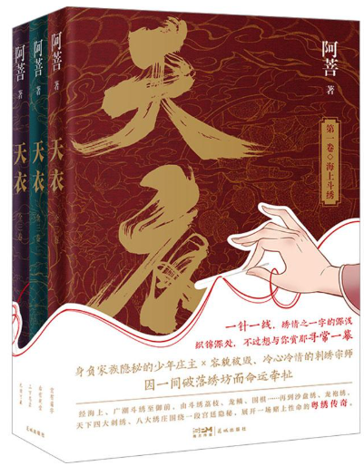 《天衣(全三卷)》包括《海上斗繡》《廣潮斗繡》《龍袍斗繡》,以有1000多年歷史、中國四大名繡之一的粵繡(即廣州刺繡、潮州刺繡)行業(yè)的發(fā)展為故事背景,從明“隆慶開關(guān)”出發(fā),以伊麗莎白一世促成英國刺繡同業(yè)公會(huì)為結(jié)束,講述了一個(gè)從海上、民間到天子座前的斗繡傳奇。