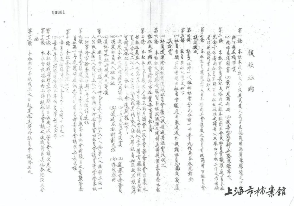 幸運的是,上海市檔案館保存有兩件復社的原始檔案,可窺一斑。檔案一為復社社約,一為復社第一屆年會記錄(1939年4月1日)。