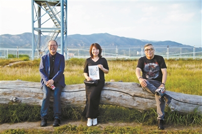 評(píng)論家孟繁華(左一)、興安(右一)與《草原十二騎手》 主編阿霞(中)在敕勒川草原為新刊拍片