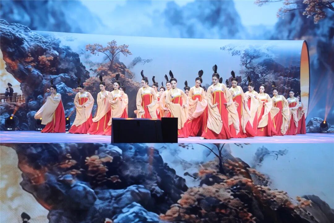 如果說《天下朋友》演繹的是一出熱忱好客的迎賓曲,那么唐代詩人白居易《琵琶行》開篇“主人下馬客在船”表達(dá)的就是一份希望遠(yuǎn)方賓朋多留片刻的真摯情感。千年之前,白居易到潯陽江邊送客,因江面上傳來一陣琵琶聲留住歸程,也成就了“音樂詩中的千古絕唱”?!讹L(fēng)起東方》旋律響起,十余位舞者身著初唐時(shí)期較為普遍的雞心領(lǐng)短襦和青色合歡袴,手持金色琵琶,在舞臺上翩翩起舞。在舞蹈節(jié)目《琵琶行》中,舞者們迎風(fēng)擺動(dòng)的衣裙,飄飄翻卷的彩帶,仿若從盛唐時(shí)期敦煌莫高窟的飛天圖壁畫中走出來,走進(jìn)不夜長安的詩歌狂歡。弦音流轉(zhuǎn)間,“嘈嘈切切錯(cuò)雜彈,大珠小珠落玉盤”的意韻猶在;琵琶聲聲響,傳遞出跨越山海的詩意和鳴。