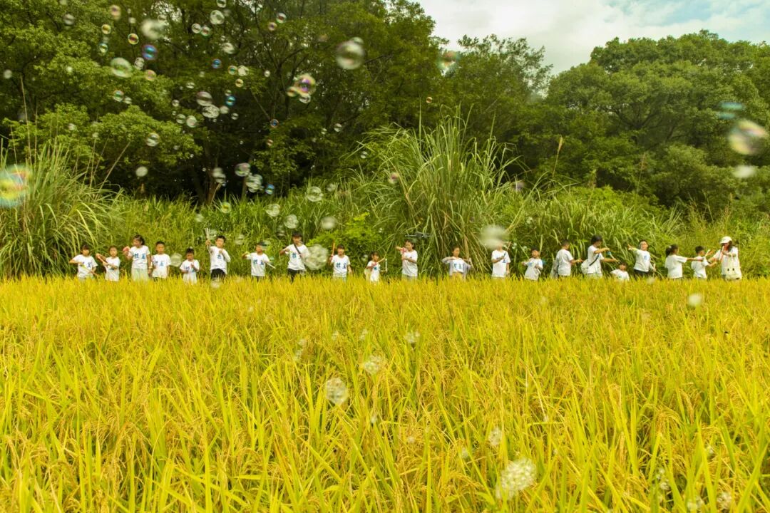 《搖籃》寶寶們3個月前栽下的青綠秧苗成長為金黃的稻谷,沉甸甸的稻穗隨風(fēng)起伏歡迎大家的到來。小朋友們在田埂上一字排開,用吹泡泡比賽慶祝豐收。