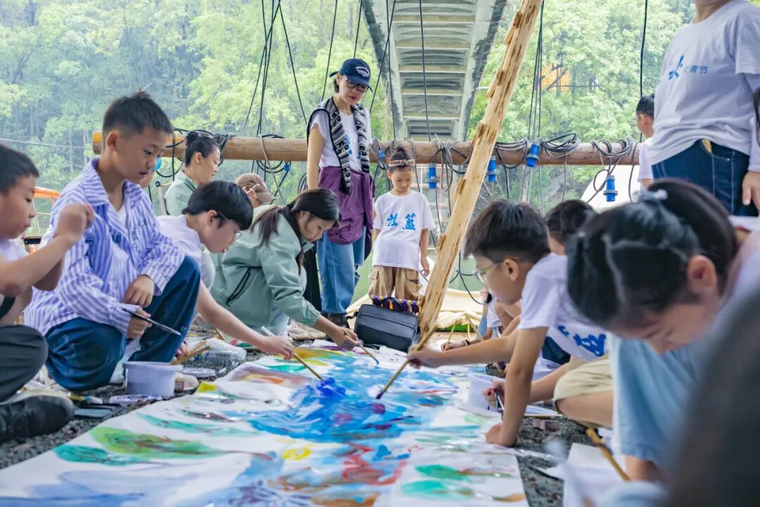 21日上午,潦河邊下起大雨,《搖籃》藝術(shù)課堂正常開講?!稉u籃》藝術(shù)課堂特邀教師寧靜把孩子們帶到河邊的橋洞下,教大家觀察河面的事物,用筆描繪看到的和想到的風(fēng)景。經(jīng)過一上午的努力,一張寫實和寫意風(fēng)格交融的6.4米丙烯畫長卷《潦河》終于完成?!稉u籃》寶寶們冒雨展開長卷,開心地與紙上的潦河及身后的潦河合影。