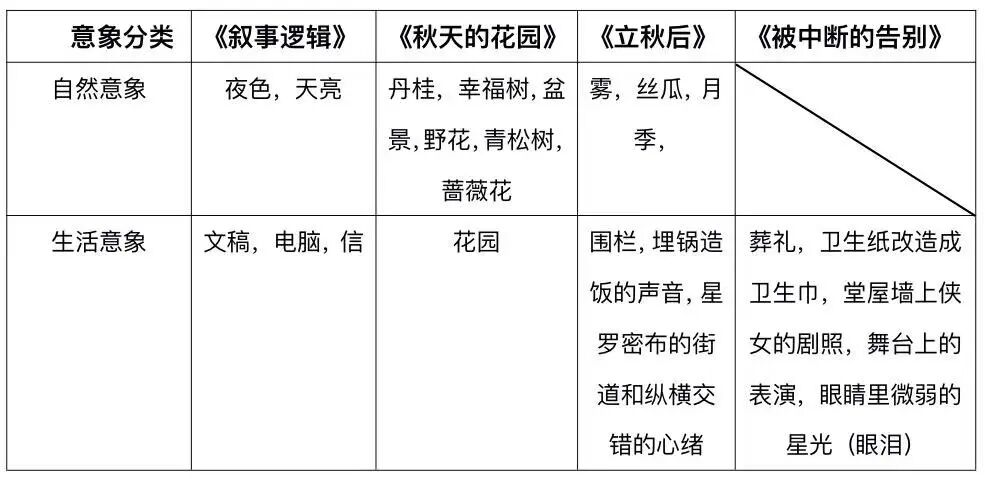 意象派詩歌的核心理論主張是“以精準(zhǔn)、清晰的意象傳遞情感與思想”,并明確提出“意象即意義”的創(chuàng)作理念。時(shí)曉詩歌中的意象系統(tǒng)同樣超越了淺表的實(shí)物描寫層面,而是成為承載豐富情感內(nèi)涵與深刻人生況味的意義載體,其意象可分為“自然意象”與“生活意象”兩大類,不同類型的意象在四首詩作中呈現(xiàn)出差異化的分布與功能: