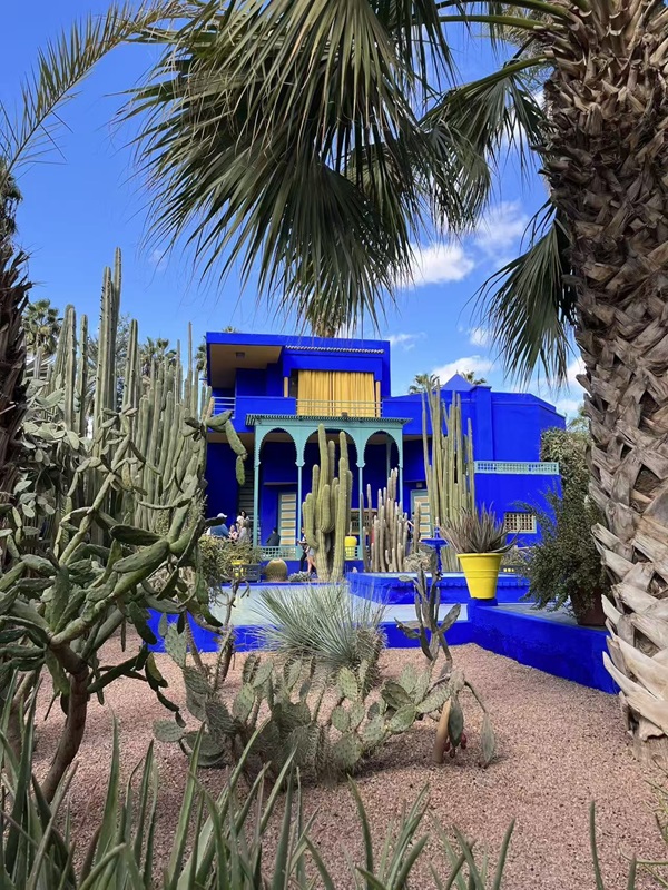 1966年,圣羅蘭和同伴貝爾熱第一次游歷摩洛哥。摩洛哥這個(gè)國(guó)家,特別是馬拉喀什這個(gè)城市,其鮮艷的色彩深深影響了圣羅蘭,為他帶去了很多靈感。當(dāng)他在馬拉喀什發(fā)現(xiàn)了馬約爾花園時(shí),立刻“被這片馬蒂斯的色彩與大自然的色彩相融合的綠洲所吸引”。1924年,法國(guó)畫(huà)家雅克·馬約爾購(gòu)得這塊土地,并建造了一座花園。1980年,圣羅蘭和貝爾熱成為了這里的新主人,對(duì)花園進(jìn)行了大規(guī)模的修復(fù)工作。畫(huà)家雅克·馬約爾的工作室被改造成一個(gè)面向公眾開(kāi)放的柏柏爾博物館,展出圣羅蘭和貝爾熱的藏品。自1966年起,每年6月和12月,圣羅蘭都會(huì)在馬拉喀什度過(guò)兩周時(shí)間,設(shè)計(jì)他的高定時(shí)裝系列。2008年6月1日,圣羅蘭因腦癌去世,享年71歲。貝爾熱把圣羅蘭的骨灰埋在了馬約爾花園。距離花園不遠(yuǎn)處的圣羅蘭博物館于2017年對(duì)外開(kāi)放,和巴黎的圣羅蘭博物館遙相呼應(yīng),共同紀(jì)念這位偉大的藝術(shù)家。漫步在馬約爾花園,這種被命名為“馬約爾藍(lán)”的色調(diào)格外醒目,讓游客以為來(lái)到了色彩斑斕的夢(mèng)幻天堂。