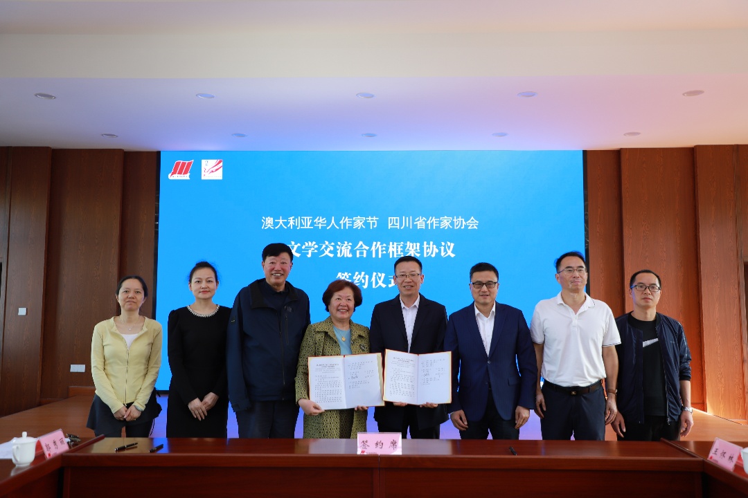 在與會嘉賓的共同見證下,雙方簽署了《澳大利亞華人作家節(jié)、四川省作家協(xié)會文學交流合作框架協(xié)議》,為兩地華文文學交流搭建長期合作平臺。同時,彭闖還向陳賀義贈送了阿來的作品《大河源》《塵埃落定》。