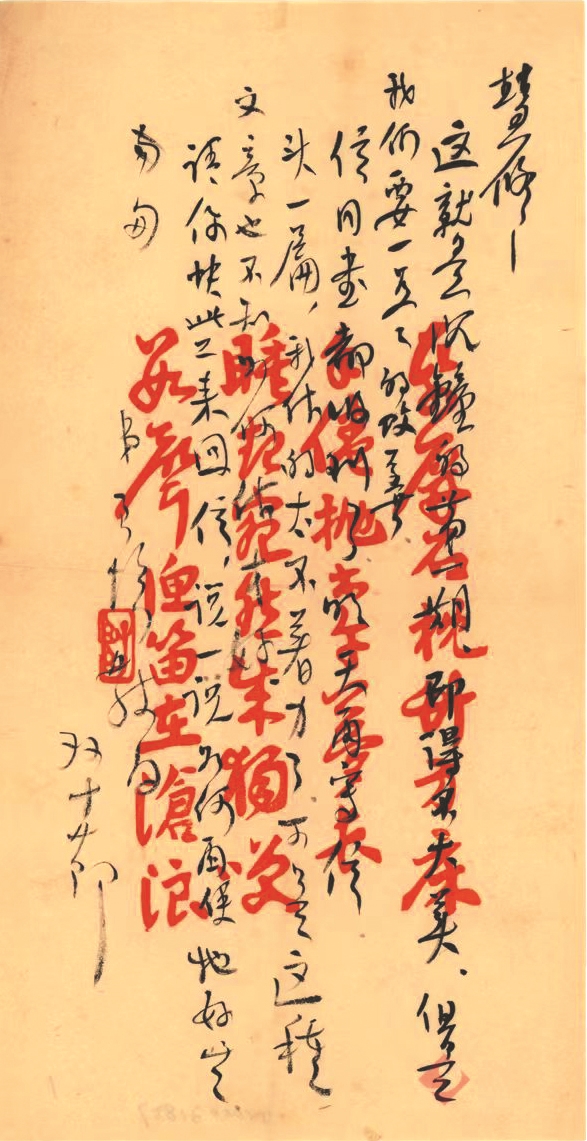 1925年10月10日,馮至(字君培)致信楊晦(字慧修)。書信內(nèi)容簡(jiǎn)短,僅103個(gè)字,墨筆行書從右向左豎行寫于彩箋之上。書信開頭便直奔主題:“這就是沉鐘的第一期”?!俺羚姟奔础冻羚姟分芸?,1925年10月10日出版??锍霭娈?dāng)天,馮至便寫信告訴楊晦出版情況,并給他郵寄了期刊。