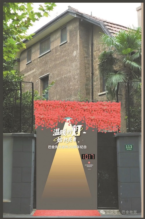 巴金故居大門(mén)用巴老最喜歡的紅玫瑰裝飾一新,一盞舊式電燈在花叢下等待過(guò)路游人。 (受訪者供圖)