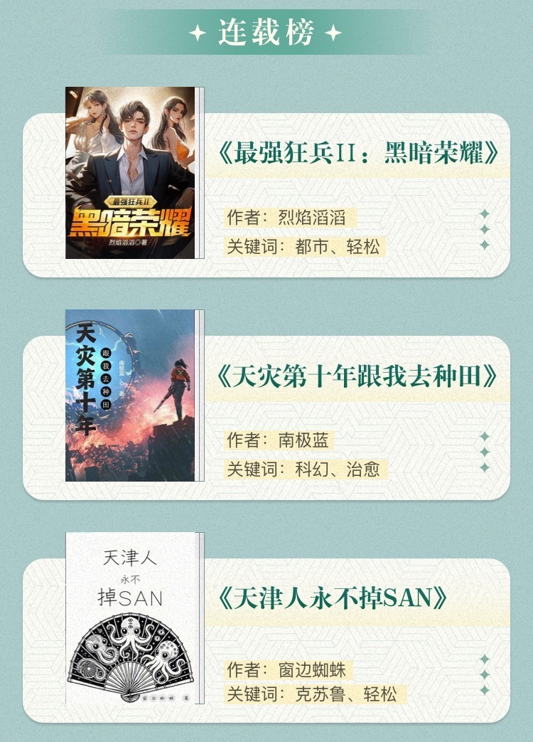 連載榜的三部作品,憑借新穎有趣的題材持續(xù)獲得廣泛關(guān)注?!蹲顝?qiáng)狂兵Ⅱ:黑暗榮耀》作為經(jīng)典男頻網(wǎng)文《最強(qiáng)狂兵》的續(xù)作,延續(xù)前作構(gòu)建的世界觀,將家族復(fù)興的主題與都市異能結(jié)合,并融入許多新興勢(shì)力,成功拓展了題材邊界,為類型創(chuàng)作注入了新鮮活力?!短鞛?zāi)第十年跟我去種田》立足末日語境,主角夏青于文明傾覆十年后開啟破局之旅——以農(nóng)業(yè)為根基復(fù)蘇生產(chǎn)力,以社群為紐帶重建社會(huì)契約,在廢墟之上踐行人類文明的延續(xù)使命?!短旖蛉擞啦坏鬝AN》以克蘇魯為題材,將西方恐怖敘事與天津地域文化成功結(jié)合,將克蘇魯風(fēng)格實(shí)現(xiàn)了本土化改造。