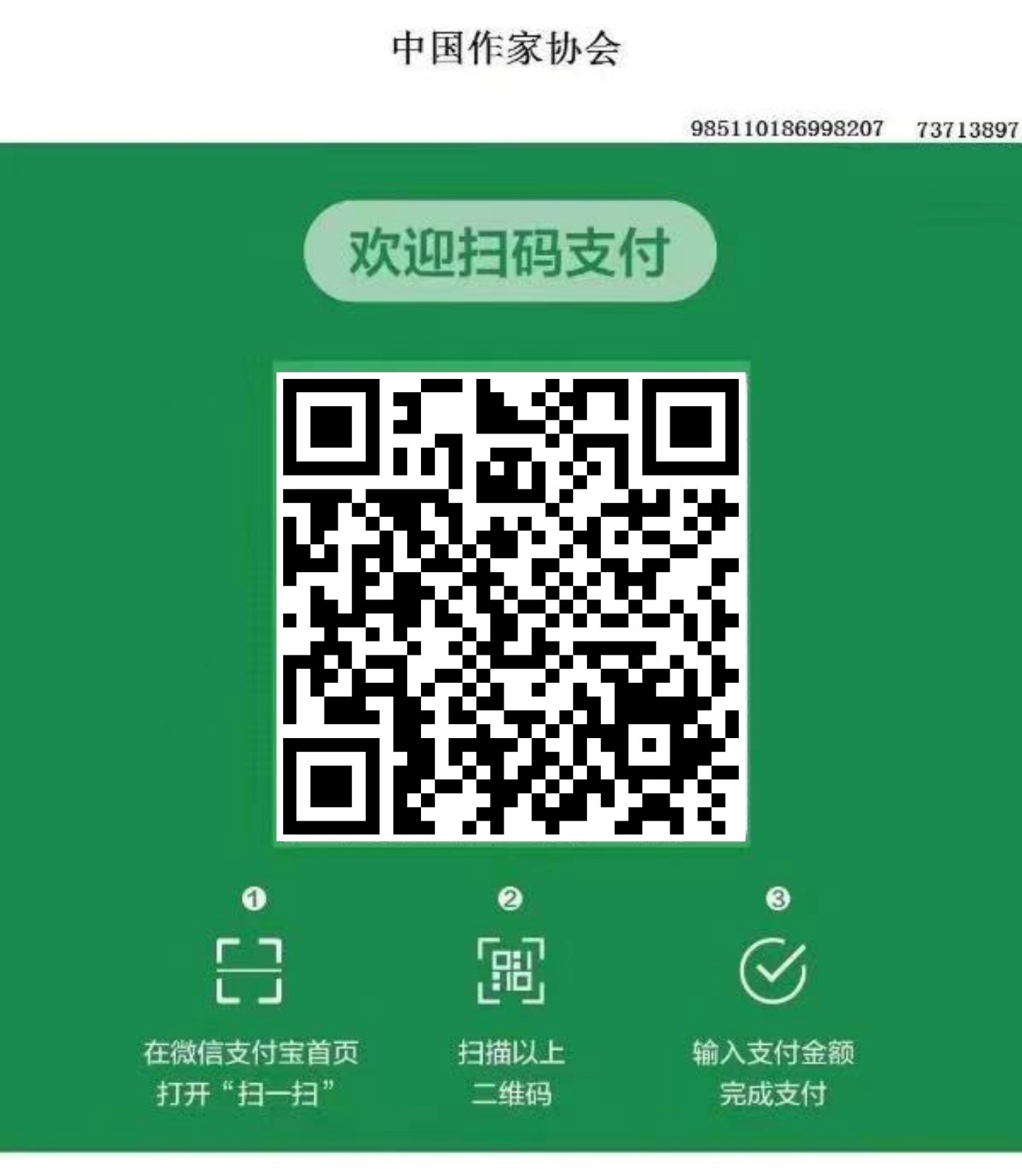 請掃描下方二維碼,通過微信或支付寶將會費(fèi)直接轉(zhuǎn)入中國作家協(xié)會銀行賬戶。