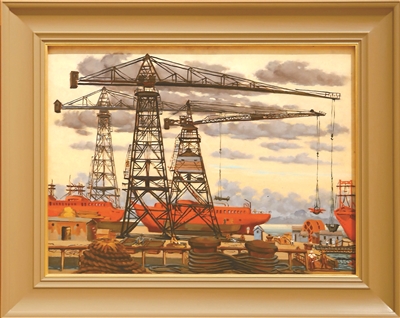 經(jīng)典作品《巨臂》就是一個(gè)典型例證。這件作品依據(jù)在大連造船廠的寫(xiě)生資料創(chuàng)作。畫(huà)面描繪了三臺(tái)矗立于港口的起重機(jī),它們形態(tài)相同,卻因巧妙的布局在畫(huà)面中各具姿態(tài)。更為精妙的是,許幸之將色彩鮮艷的橙色大船置于起重機(jī)之后,并未展現(xiàn)全貌。常人或許不會(huì)以如此平視的角度刻畫(huà)這三臺(tái)起重機(jī),更不會(huì)想到將大船作為背景。而許幸之巧妙的構(gòu)圖視角,正是其創(chuàng)作的獨(dú)具匠心之處。