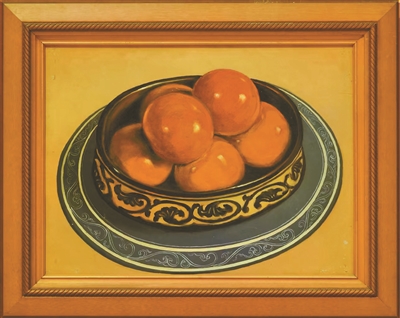 許幸之的靜物畫(huà)偏愛(ài)描繪陶瓷與水果植物。他選擇陶瓷,不僅因?yàn)樗侵袊?guó)的象征,更因?yàn)樘沾稍诠饩€下所呈現(xiàn)的色澤,正是他在油畫(huà)語(yǔ)言中國(guó)化探索中亟欲解決的核心問(wèn)題。陶瓷表面有釉,反光強(qiáng)烈,色澤又極為鮮艷,這種獨(dú)特質(zhì)感在光影中所形成的視覺(jué)感受,成為許幸之努力捕捉與表現(xiàn)的對(duì)象。對(duì)許幸之而言,若能以油畫(huà)的語(yǔ)言完美再現(xiàn)中國(guó)陶瓷的質(zhì)感色澤,將會(huì)是油畫(huà)在新中國(guó)語(yǔ)境下實(shí)現(xiàn)民族化的重要進(jìn)展。