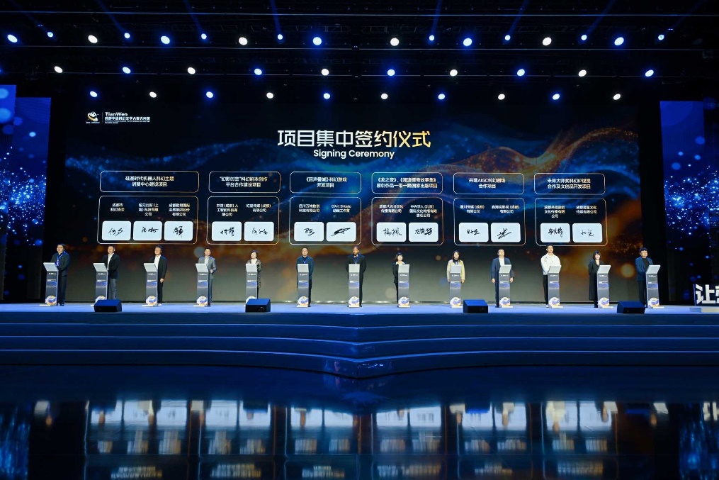 活動最后,還舉行了硅基時代機(jī)器人科幻主題消費(fèi)中心建設(shè)、“幻影時空”科幻劇本創(chuàng)作平臺合作建設(shè)、《回聲疊城》科幻游戲開發(fā)、《龍之變》《海漄怪奇作品集》原創(chuàng)作品一帶一路國家出版、共建AIGC科幻劇場合作項目未來大師獎科幻IP視覺合作及文創(chuàng)品開發(fā)等6個項目簽約儀式。
