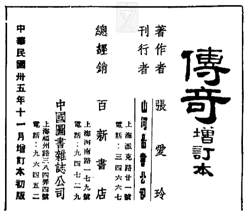 《離滬之前》一文提到《傳奇》增訂本的內(nèi)容大致有以下幾點:第一,增訂本的籌備出版與張愛玲寫電影劇本《不了情》幾乎同時;第二,增訂本的內(nèi)容、編排、封面設(shè)計、校對,都是張愛玲籌劃和完成的,就連版權(quán)頁上的印章,也是張自己一本一本蓋上去的;第三,龔之方自認在兩件事上提供了幫助:和?;∫黄鹑フ亦嚿⒛緸榧宇}簽(是隸書不是楷書,原文誤記);虛構(gòu)了“刊行者:山河圖書公司”以符合當(dāng)時出版的要求,其實沒有這家出版公司,而是自己和唐大郎寫稿的地方。當(dāng)然文中也有幾處誤記,不涉及主旨暫時不論。