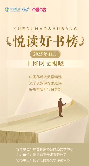 11月15日,由中國作家協(xié)會網(wǎng)絡(luò)文學(xué)中心指導(dǎo),咪咕數(shù)字傳媒有限公司主辦、揚(yáng)子江網(wǎng)絡(luò)文學(xué)評論中心協(xié)辦的“悅讀好書榜”第十一期榜單正式揭曉。