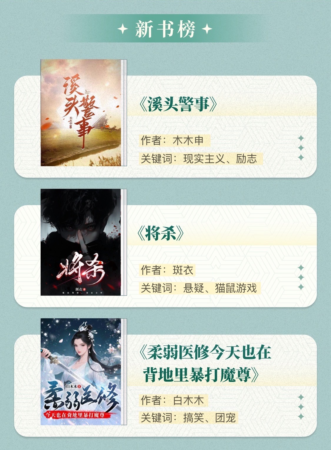 在新書榜中,三部新作在類型文的基礎(chǔ)上展開了新的突破?,F(xiàn)實主義題材作品《溪頭警事》扎根當(dāng)下基層現(xiàn)實,通過數(shù)字化改革的生動實踐讓網(wǎng)絡(luò)文學(xué)成為記錄時代變革的載體,展現(xiàn)出網(wǎng)絡(luò)文學(xué)參與主流價值構(gòu)建的積極姿態(tài)。懸疑作品《將殺》在劇情爽感之外,深層次聚焦家暴、創(chuàng)傷與人性困局,使作品具備兼具類型吸引力與現(xiàn)實關(guān)懷的思想深度。女頻玄幻作品《柔弱醫(yī)修今天也在背地里暴打魔尊》則通過對人物的反套路設(shè)定與幽默的敘事風(fēng)格,在遵循修仙類型規(guī)則的基礎(chǔ)上完成創(chuàng)意重塑,為修仙類型寫作提供了可借鑒的范式。