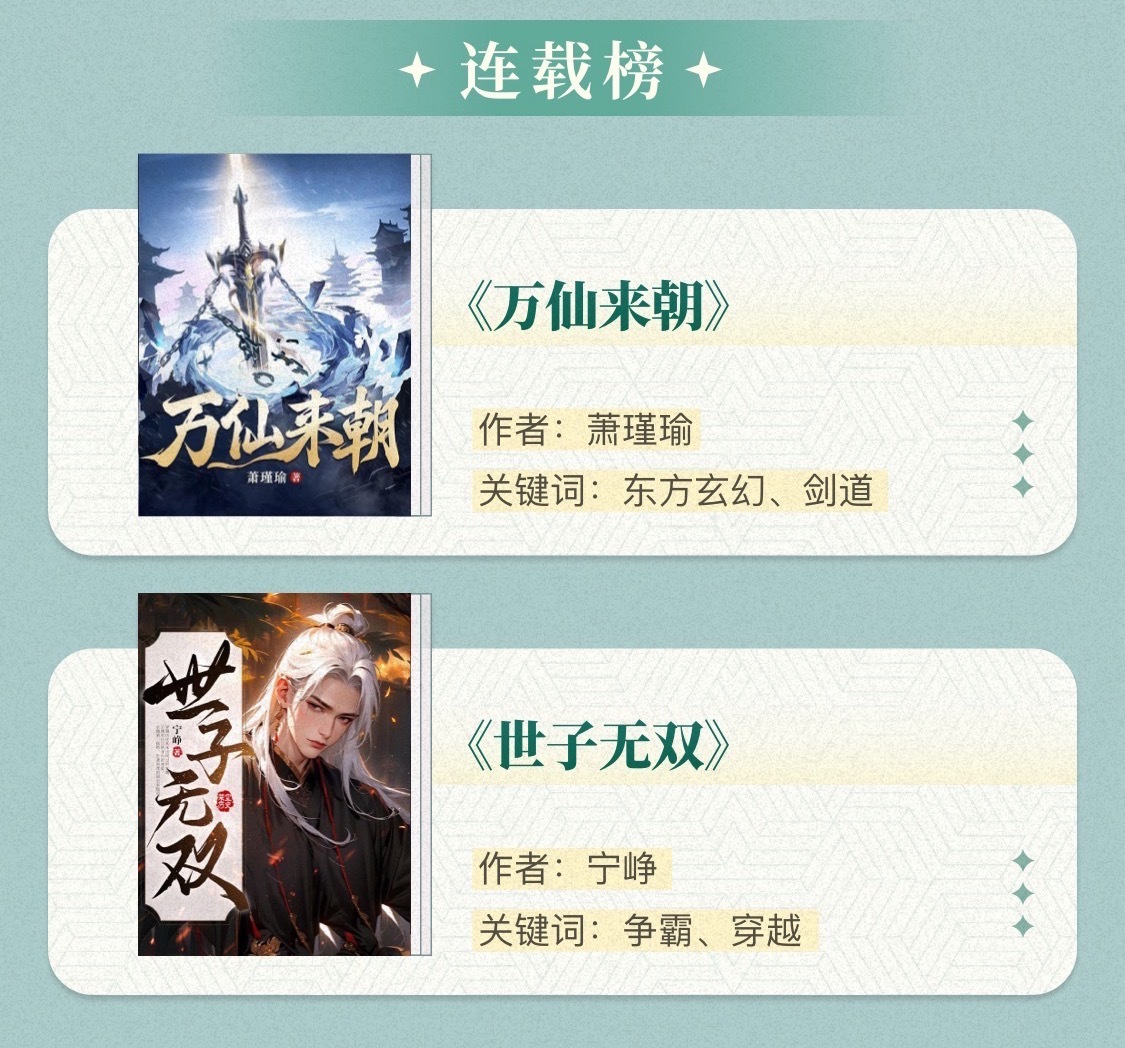 兩部入選連載榜的作品中,都在多線的敘事結(jié)構(gòu)下,將主角人物線與成長線刻畫得更加飽滿。東方玄幻作品《萬仙來朝》以“諸天為囚籠,萬仙皆獄卒”為核心設(shè)定,搭建出格局開闊的仙俠世界。大量配角各具性格與命運(yùn),卻故事線彼此牽連,形成完整的因果網(wǎng)絡(luò),共筑“守望相助”的仙俠世界觀。穿越題材作品《世子無雙》將穿越設(shè)定與權(quán)謀結(jié)構(gòu)緊密結(jié)合,以現(xiàn)代視角重構(gòu)古代權(quán)力博弈的解題路徑,人物內(nèi)核塑造清晰堅韌。