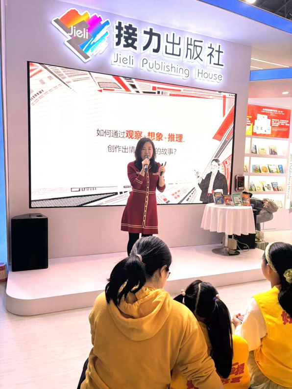 分享會(huì)巧妙設(shè)計(jì)了互動(dòng)環(huán)節(jié),將寫作方法融入游戲。在“偵探能力練一練”中,葛競借用書中的情節(jié)——幫主人公包達(dá)達(dá)拼合有規(guī)律的破碎寶石,引導(dǎo)孩子們化身小偵探,通過觀察細(xì)節(jié)、尋找規(guī)律來解決問題。這一環(huán)節(jié)讓孩子們親身體驗(yàn)到,精彩的故事情節(jié)源于對(duì)生活的細(xì)致觀察和邏輯推理。