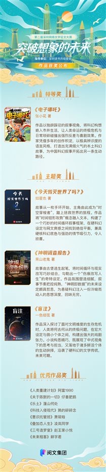 本屆征文大賽以“突破想象的未來”為主題,聚焦科幻IP孵化,挖掘精品網(wǎng)文故事,下設(shè)“未來人類生活”“新技術(shù)下的新冒險(xiǎn)”“自由意志的新生命”三大方向,共征集參賽作品兩萬余部。其中,《電子哪吒》獲特等獎(jiǎng),《今天毀滅世界了嗎?》《神明調(diào)查報(bào)告》《盲注》獲主題獎(jiǎng),《人類重建計(jì)劃》等8部作品獲得優(yōu)秀作品獎(jiǎng)。
