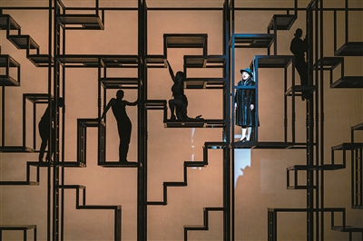 劇情推進至麥基與波莉的婚禮場景,當波莉唱起《海盜珍妮》時,銀色幕簾緩緩升起,核心表演區(qū)才真正出現(xiàn)在觀眾眼前。舞臺由六個可移動的巨型黑色幾何框架組合而成,框架內(nèi)分布著不規(guī)則的平臺、階梯與可開合的機關板,供演員穿梭攀爬。不過在多數(shù)時候,演員會從不同方向爬至其中一個狹窄空間,在定點光的聚焦下直面觀眾表演。