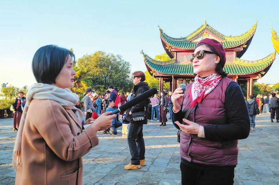 香港作家周蜜蜜在岳陽樓前接受岳陽日報記者采訪。岳陽市作協(xié)供圖